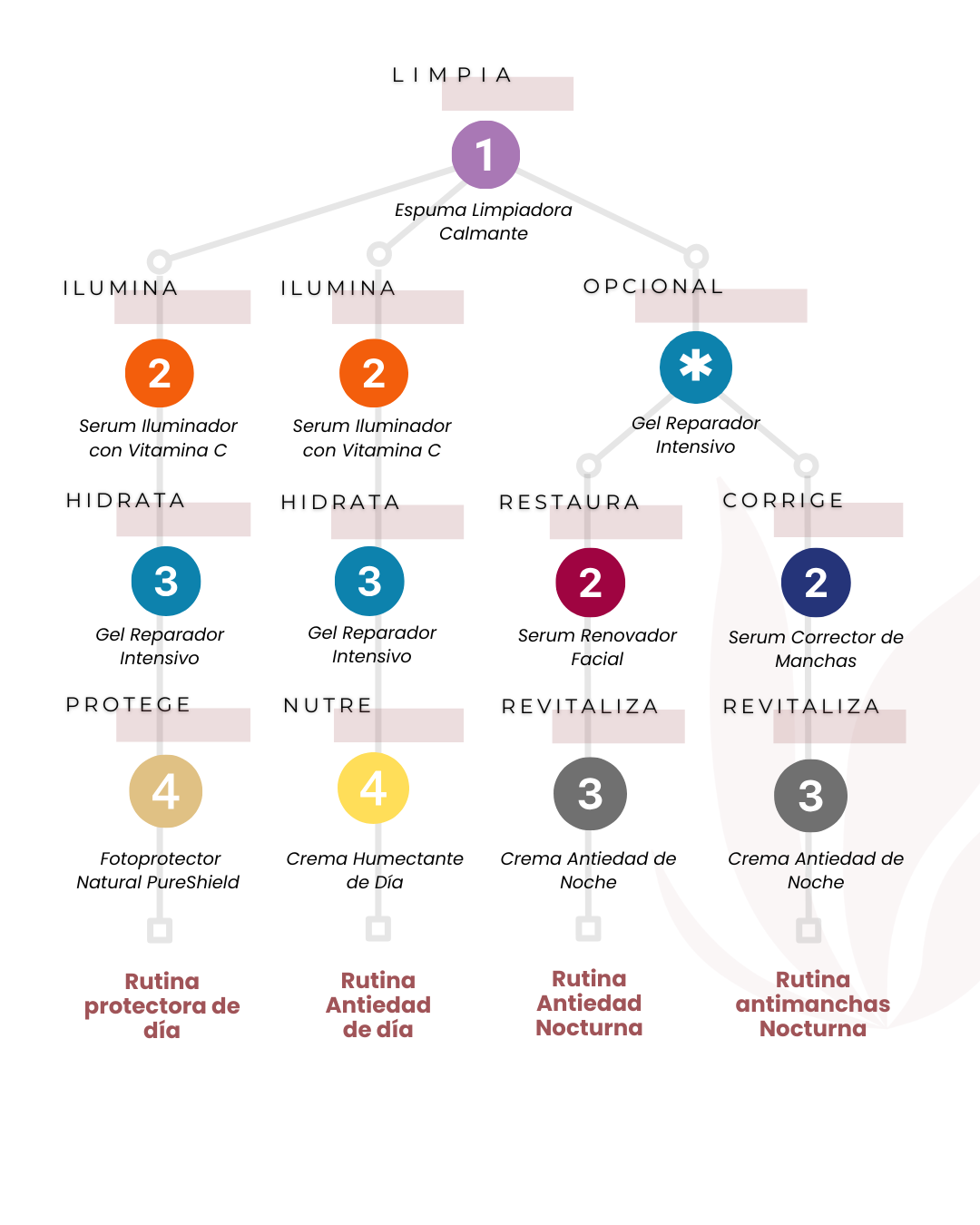 Semana 3: agrega Renovador Facial (noche 2) - Evita usar el Sérum Corrector de Manchas y el Sérum Renovador Facial en la misma noche.