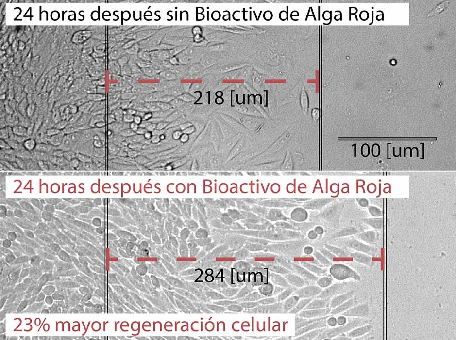 Pruebas realizadas en el Bioactivo de Alga Roja demostraron un incremento en la renovacion celular. Esto significa que el Bioactivo promueve la reproducción de celulas jovenes en tu piel, capaces de darle sostén y firmeza a la piel.